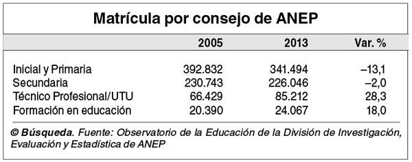 Según datos del Observatorio de la Educación de la División de Investigación, Evaluación y Estadística de ANEP, en 2005 la UTU contaba con 66.429 alumnos y en 2013 llegó a los 85.212. Ese cambio en el tiempo no se repite en la mayoría de los otros subsistemas de la ANEP: el Consejo de Educación Inicial y Primaria (CEIP) pasó en ese lapso de 392.832 a 341.494 alumnos y el Consejo de Educación Secundaria (CES) de 230.743 a 226.046. El único que aumentó su matrícula fue el Consejo de Formación en Educación (CFE), aunque en menor cantidad: de 20.390 en 2005 a 24.067 el año pasado.