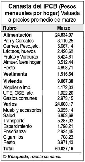Mientras, el índice de Precios al Consumo de Búsqueda (IPCB) registró una variación de 0,67% en marzo, en línea con la tendencia que proyectaba la estimación de la primera quincena. Como consecuencia de eso, la canasta familiar —referida a un grupo familiar de ingresos medios de Montevideo, con un tamaño promedio de 3,3 personas por hogar y en el que dos de ellas perciben ingresos— ascendió a $ 60.027,16. Eso es $ 400 más que en febrero.