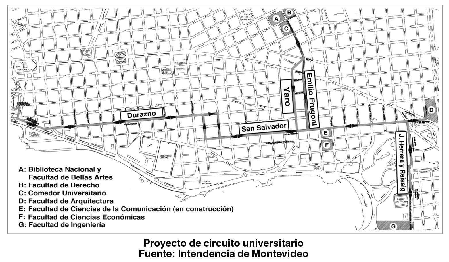 En la calle Emilio Frugoni se podrá continuar en dirección a la Facultad de Derecho, Biblioteca Nacional, Facultad de Bellas Artes, comedor universitario y el Espacio Interdisciplinario de la Udelar. Mientras que en la calle Julio Herrera y Reissig habrá ciclovía para llegar hasta la Facultad de Ingeniería (ver mapa).
