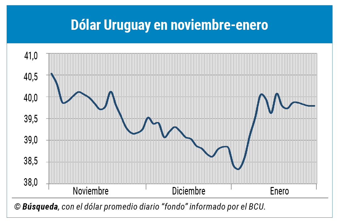 Un operador cambiario dijo a Búsqueda que la “presión compradora” compensó la oferta de divisas traídas por los turistas, en el inicio de una temporada de verano mejor que las anteriores. Sobre la tendencia a futuro del precio del dólar, señaló que el dato de inflación de diciembre en Estados Unidos que se informará hoy jueves 12 será “relevante” para saber si cabe esperar menores tasas de política monetaria en ese país.