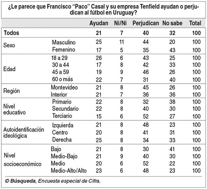 En todos los grupos analizados son más numerosos los que opinan que Casal y Tenfield perjudican al fútbol que los que piensan que lo benefician. “Francisco Casal y Tenfield han generado mucha polémica a lo largo de los últimos 25 años. Hubo varios momentos memorables del vínculo entre el fútbol uruguayo y el empresario, entre los cuales quizás el más recordado es el cartel de ‘Gracias Paco’ que apareció en el tablero electrónico del Estadio Centenario al finalizar el partido repechaje ante Australia que clasificó a Uruguay al Mundial de Corea-Japón 2002”, señala Cifra en el informe.