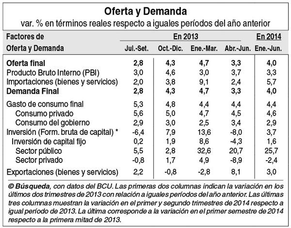 Considerando esas revisiones, en todo el primer semestre de 2014 el PBI se expandió 3,3% frente a un año atrás y proyecta para todo el promedio de 2014 un piso de crecimiento de 3,13% (por el “arrastre estadístico”), calculó Búsqueda. Eso está en línea con lo que espera el gobierno (en torno a 3%).