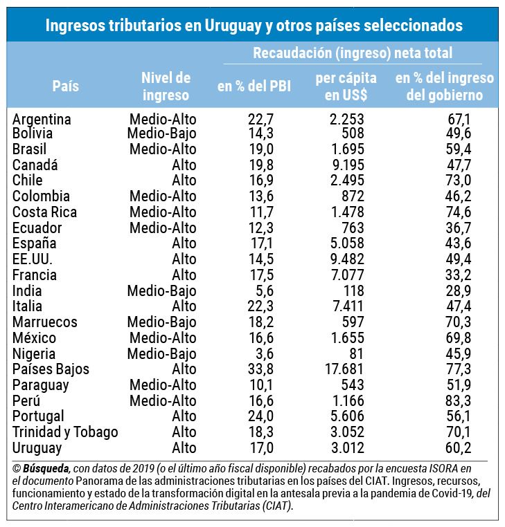 Las oficinas relevadas por el ISORA cobran diversos tributos, en algunos casos solo nacionales (como la DGI uruguaya) y otras también recaudan gravámenes aduaneros y/o aportes jubilatorios. El ingreso total neto gestionado alcanzó en 2019 un valor promedio equivalente a 17,3% del Producto Bruto Interno-PBI para los países analizados (si bien algunos cierran su año fiscal en marzo, junio o setiembre, y no en diciembre). Con un 17% del PBI, Uruguay se ubicó levemente por debajo de esa media, lo que a su vez, en dólares por habitante, equivalió a US$ 3.012; eso se compara en la región, por ejemplo, con los US$ 543 per cápita y 10,1% del PBI de Paraguay —un país que se promociona frente a la inversión por su baja presión fiscal— o los US$ 2.253 (22,7% del Producto) en el caso de Argentina.