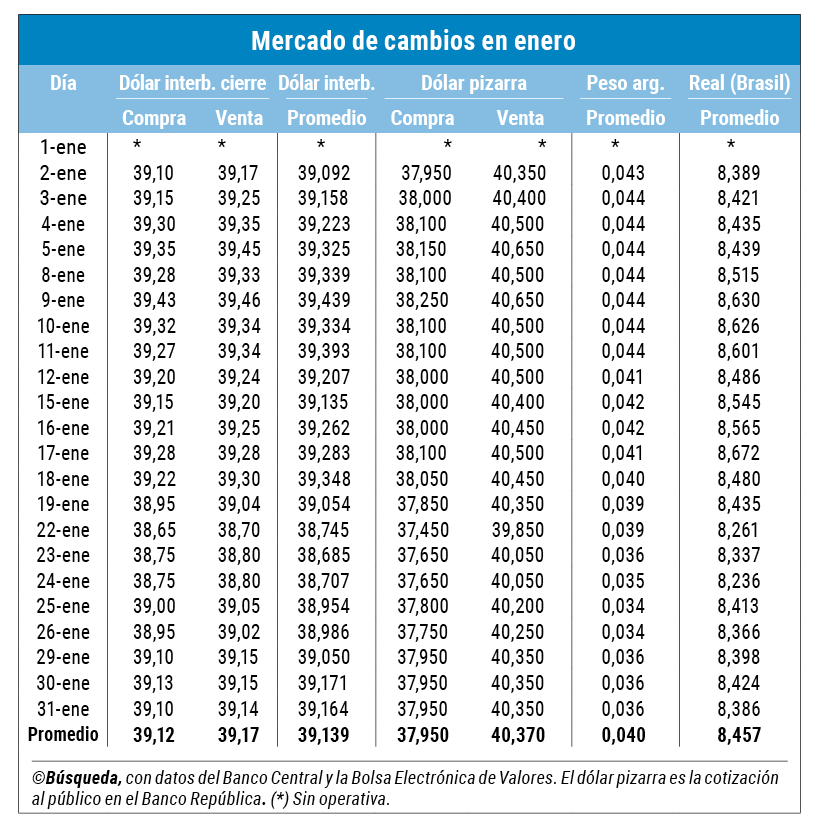 En caso de que tengas dudas o consultas podés escribir a [email protected] contactarte por WhatsApp acáEn el circuito “interbancario” o mayorista, la divisa encadenó cinco alzas consecutivas —desde el miércoles 24— y desde el lunes 29 se negoció a precios promedio por encima de los $ 39. Ayer lo hizo a $ 39,164, informó el Banco Central (BCU). Ese valor es 0,36% mayor que al cierre de 2023, aunque si se comparan promedios mensuales el tipo de cambio cedió 0,42% en enero.