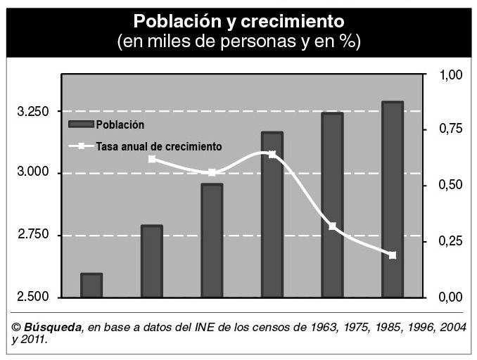Uruguay tiene 3.286.315 habitantes, según el último censo de 2011 del Instituto Nacional de Estadística (INE). Si se analiza la evolución de la población del país (ver gráfica) se observa un crecimiento muy lento, ya que en 1963 ya había 2.595.510 uruguayos.