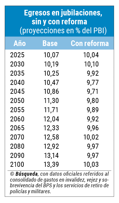 Las proyecciones definitivas indican que el gasto que se destinará al Banco de Previsión Social (BPS) y los servicios militares y policiales representarán 10% del Producto Bruto Interno (PBI) a partir del 2070. Sin cambios en el sistema, esos egresos superarían el 13%, según cifras oficiales a las que accedió Búsqueda.