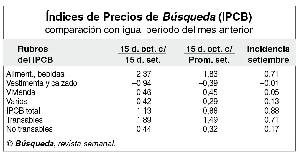 En los primeros quince días el índice de Precios al Consumo de Búsqueda (IPCB) subió 0,88% respecto al promedio de setiembre y lo hizo 1,13% frente a la mitad inicial de dicho mes. Esa última variación es la que proyecta la tendencia inflacionaria para todo octubre.