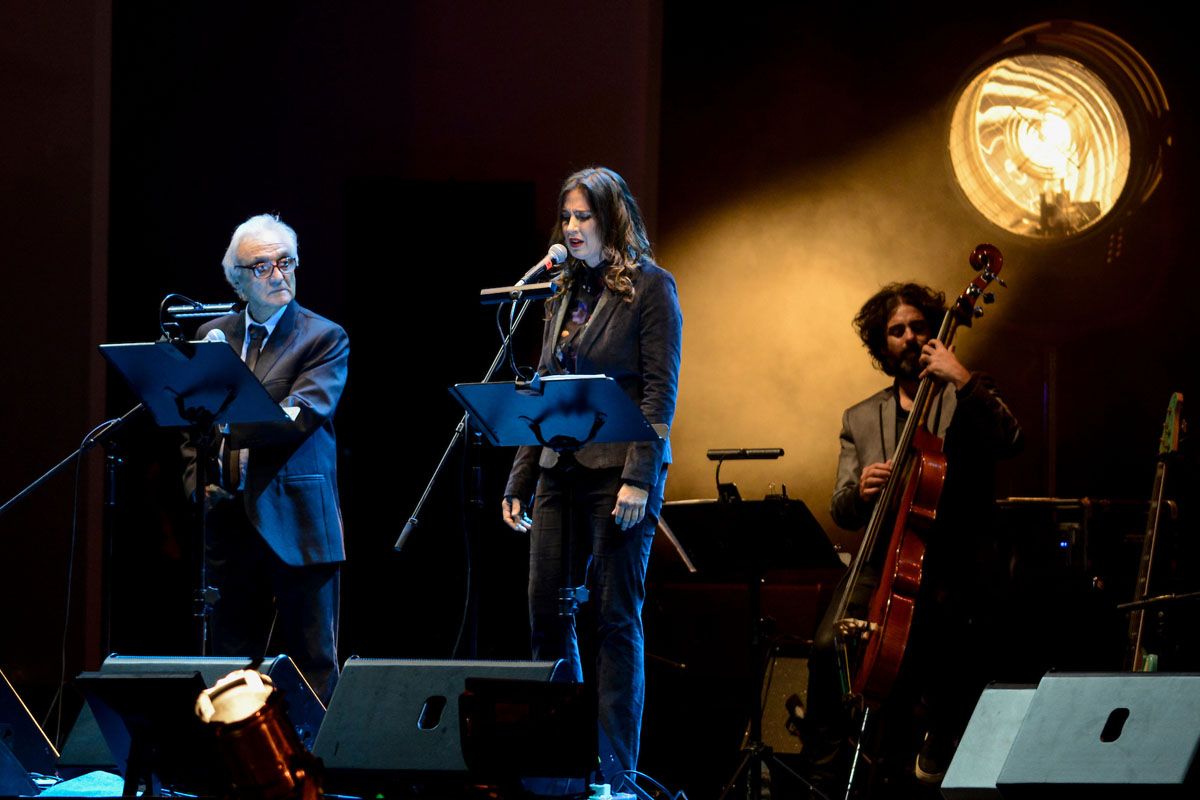 Julio Calcagno junto a Malena Muyala y Checo Anselmi en el espectáculo Zitarrosa 80, en el Estadio Centenario, en 2016. Foto: Santiago Mazzarovich, adhocFOTOS