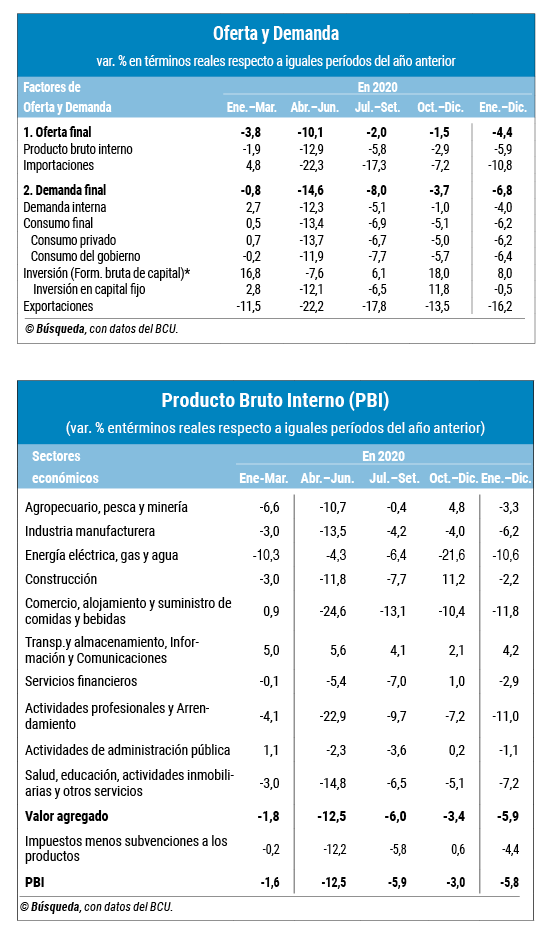 De las estadísticas de Cuentas Nacionales difundidas el miércoles 24 por el Banco Central (BCU) surge que también hubo una disminución en las importaciones de bienes y servicios, con lo que la oferta final se contrajo 4,4% el año pasado. Por el lado de la demanda se dio una baja en el consumo privado (–6,2%) y público (–6,4%), así como de las exportaciones (–16,2%); en cambio, aumentó 8% la inversión (formación bruta de capital).