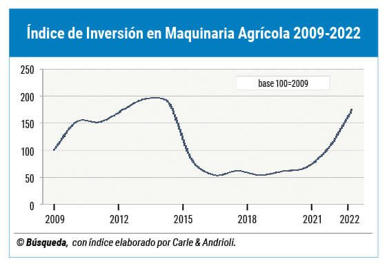 Por cuarto año consecutivo, la inversión en activos fijos por parte del sector agrícola nacional creció en 2022, y lo hizo incluso a un ritmo más acelerado. Según el Índice de Inversión en Maquinaria Agrícola (Idima) elaborado por Carle & Andrioli con base en los valores importados de tractores, cosechadoras y sembradoras, el aumento fue de 65% frente a 2021.