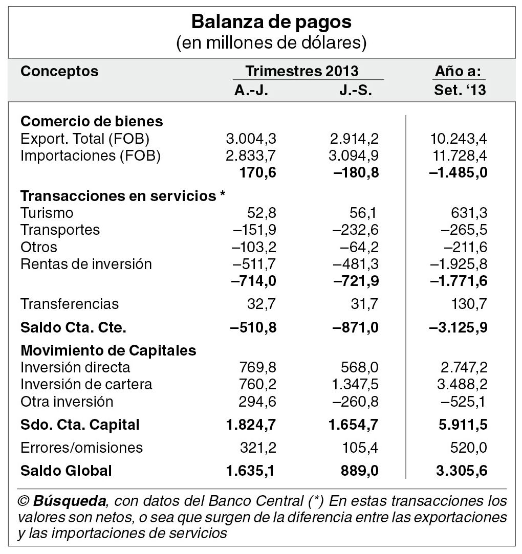 La cuenta corriente —balance comercial, de rentas del capital y transferencias— se deterioró y el déficit llegó a U$S 3.125 millones en el año cerrado a setiembre. Eso representa 5,7% del PBI.