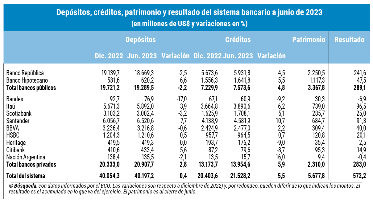 En los 12 meses cerrados a junio, los bancos privados tuvieron una rentabilidad de 24,5% sobre el patrimonio y de 1,9% respecto a los activos. Una fuente del sector financiero dijo a Búsqueda que son cifras “muy buenas”, a pesar de que las tasas cobradas por los bancos por los préstamos “no subieron en Uruguay como lo hicieron en otros países del mundo”. Eso, agregó, fue un motivo adicional por el cual creció la rentabilidad en el contexto de políticas monetarias contractivas.