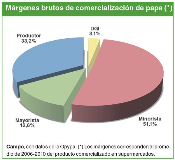 Asumiendo una serie de supuestos —entre ellos, que el mayorista cobra un 20% de comisión sobre el precio de compra al productor—, calcularon dicho margen entre 2006 y 2010 para un grupo de productos seleccionados. Según esas estimaciones para la comercialización en ferias, el granjero obtiene un margen bruto que varía entre un máximo de 48%-49%(para la manzana y la cebolla) y un mínimo de 38% para la zanahoria. El margen para el mayorista varía entre 14% y 18%, el minorista entre 29% y 44%, mientras que la Dirección General Impositiva se apropia de entre 3% y 4% del precio final.