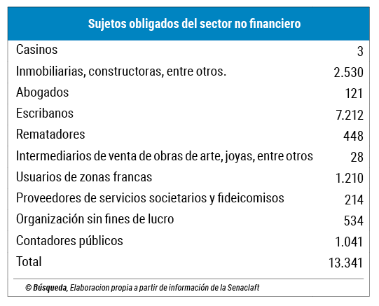 La Senaclaft es el organismo a cargo de controlar a los sujetos obligados del sector no financiero que deben establecer mecanismos de análisis y reportar las operaciones sospechosas de lavado en las que participen. En esa categoría se encontraban, a octubre del año pasado, 13.341 profesionales o entidades (ver cuadro).