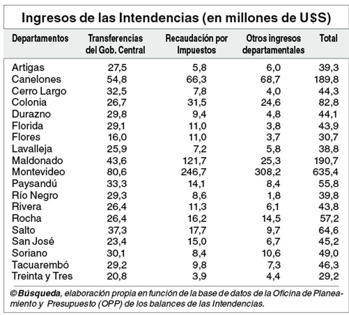 De hecho, las 19 intendencias reciben transferencias de la Tesorería Nacional y para 14 de ellas, ese dinero representa la mayor parte de sus recursos. Sólo Montevideo, Maldonado, Canelones, Colonia y Rocha se autofinancian con los tributos que cobran y otros ingresos la porción principal de su presupuesto, calculó Búsqueda a partir de datos de las Rendiciones de Cuentas de 2013 de cada departamento compendiados por la Oficina de Planeamiento y Presupuesto. Los números del ejercicio 2014 apenas están llegando a esa dependencia de la Presidencia.