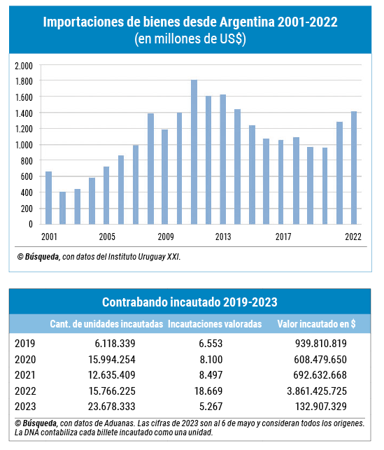 Desde que empezó el año y hasta el sábado 6 Aduanas incautó 23.678.333 unidades de diversos rubros, desde autos hasta alimentos, artículos de higiene personal o limpieza del hogar. También decomisó plata no declarada; en sus estadísticas el organismo contabiliza cada billete como una unidad —fueron más de 7 millones solo de Argentina entre enero y el 6 de mayo—, lo que abulta la cifra global (Búsqueda N° 2.223).