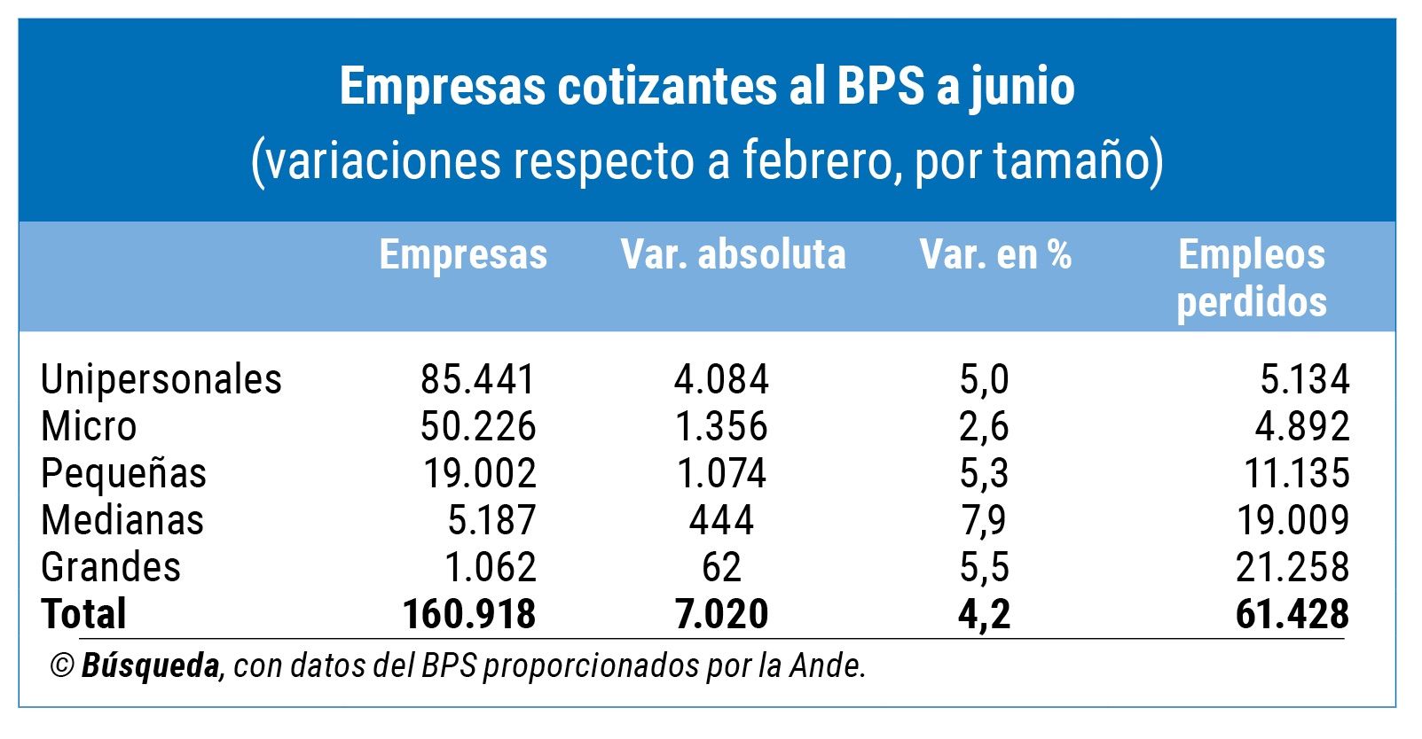 Según los datos proporcionados a Búsqueda por la Ande, la baja en los registros del BPS de las 62 empresas grandes —que emplean a más de 100 personas y superan los 75 millones de unidades indexadas a la inflación de facturación anual— significó la pérdida de 21.258 empleos formales. Sumado eso a los 40.170 de las Mipymes, el total de puestos menos fue de 61.428 respecto a febrero.