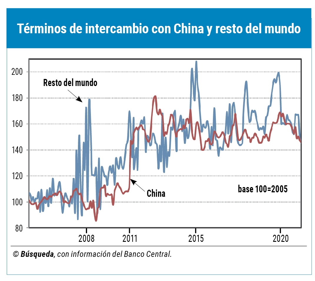 Aunque con oscilaciones más bruscas que parecen ser la excepción a la regla, los términos de intercambio con el “resto del mundo” se explican en gran parte por lo que ocurre con la relación de precios con China.